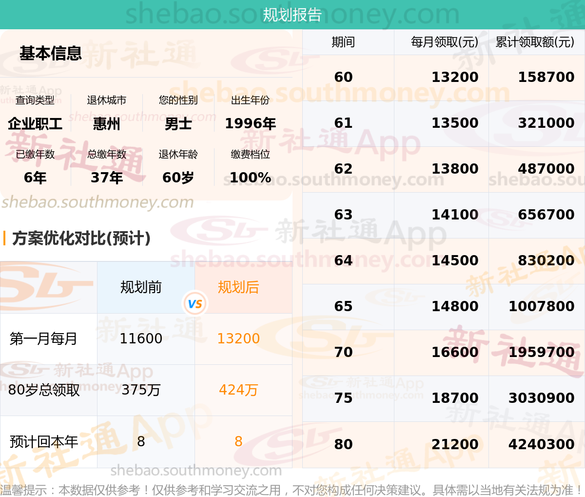 规划前:参保城市:广东惠州,性别:男士,出生年月:1996,已缴年限:6年,总缴年数:37年,退休年龄:60岁,缴费档位:100%。