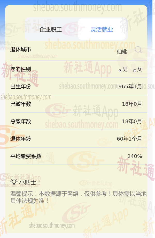 和社保网-APP一起看个例子,仙桃工龄18年养老退休金如何计算?