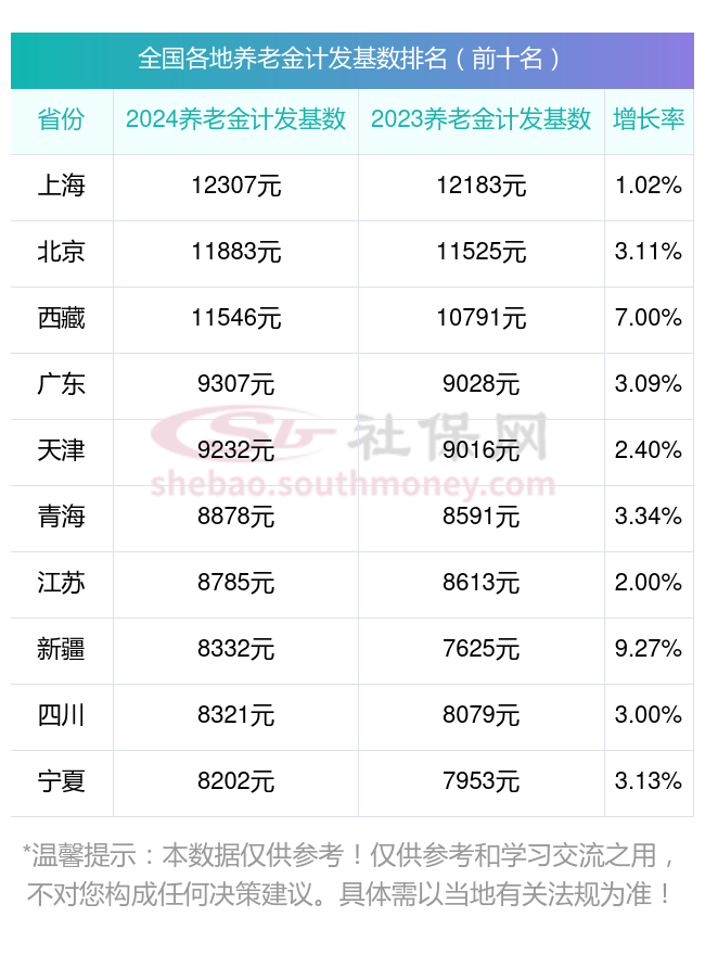 据新社通app显示,上海位列第一位,养老金计发基数达到12307.00元,增长率为1.02%;