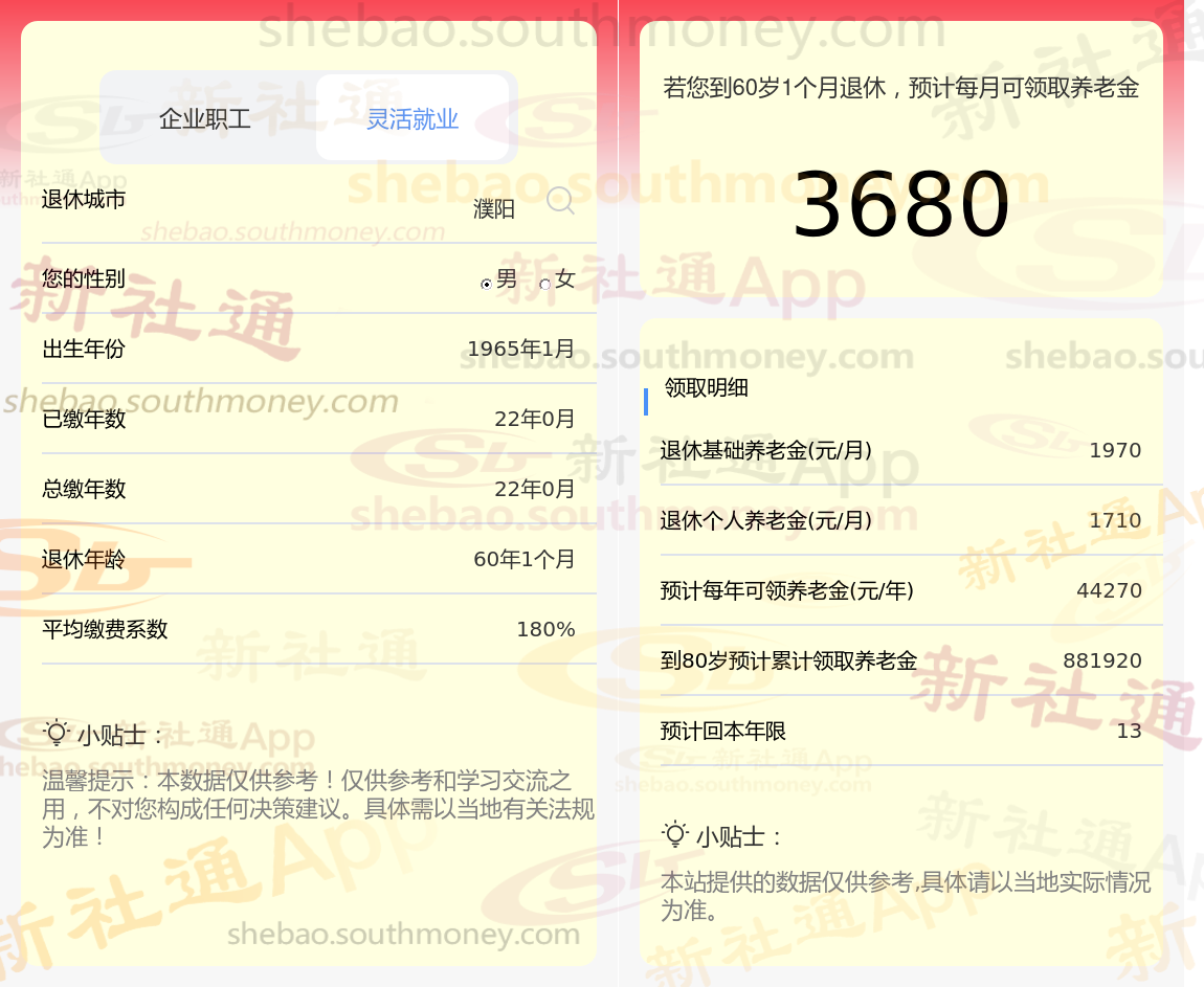 退休城市:濮阳,性别:男,出生年份:1965,总缴年数22年,缴费档次:180%,新社通app养老金计算器所得:
