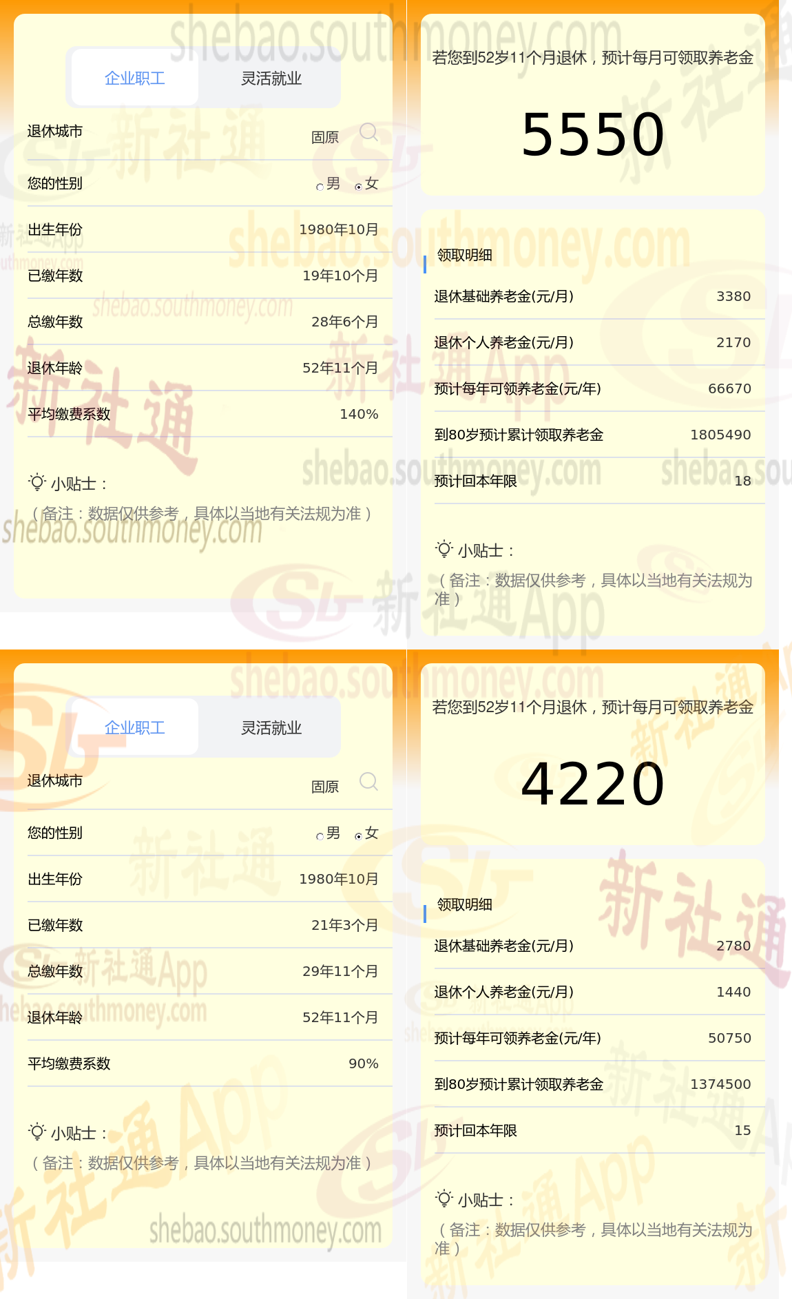 根据新社通app养老金计算器,轻松测算您的养老金!计算所得出:朱某与老杜的差别,缴费年限、缴费档位不同的情况下,差别5550-4220=1330元。