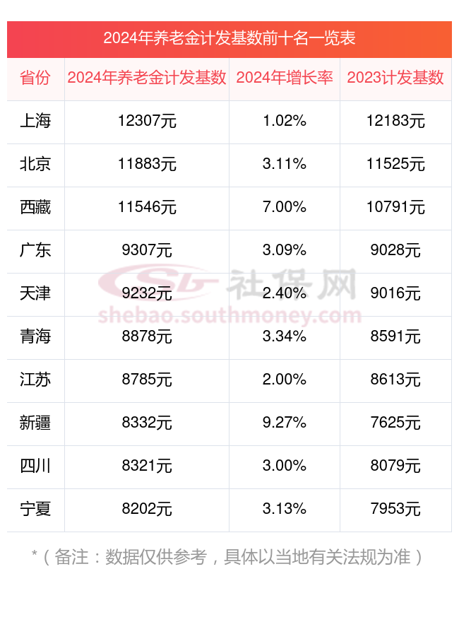 一、2023-2024年全国各地养老金计发基数排名前十