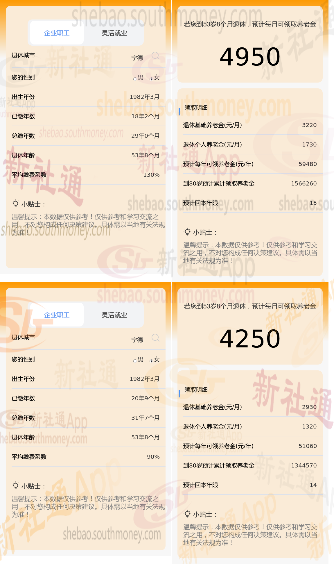 根据新社通app养老金计算器,轻松测算您的养老金!经过详细计算,夏某与老秦在养老金方面的差距主要归因于他们不同的缴费年限和缴费档位,这一差距量化后为700元,即,夏某的养老金4950元相较于老秦的养老金4250元多出的部分。