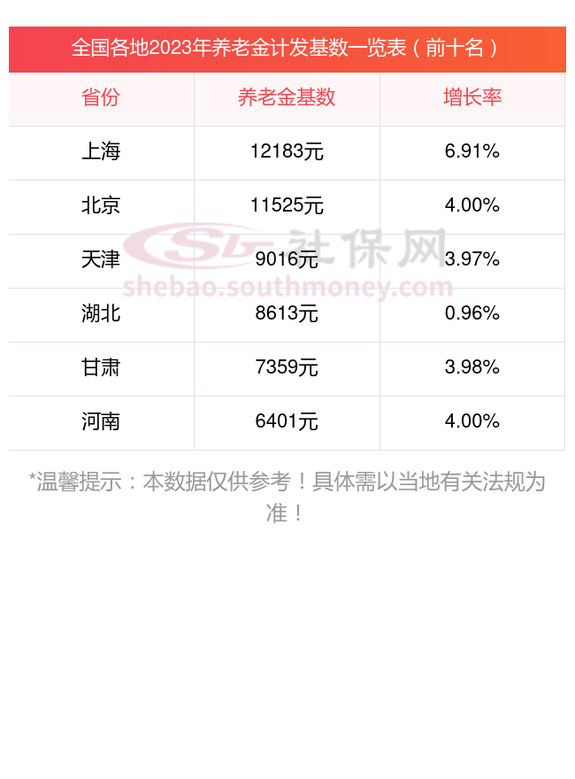 据新社通app显示,下面来看看全国各地2023年养老金计发基数一览表(前十名)