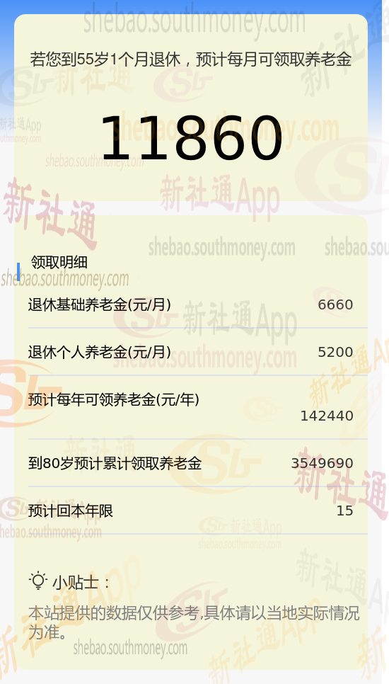 每月可领养老金总额:将基础养老金与个人养老金相加,每月可领取的养老金总额约为11860元(6660元+5200元)。
