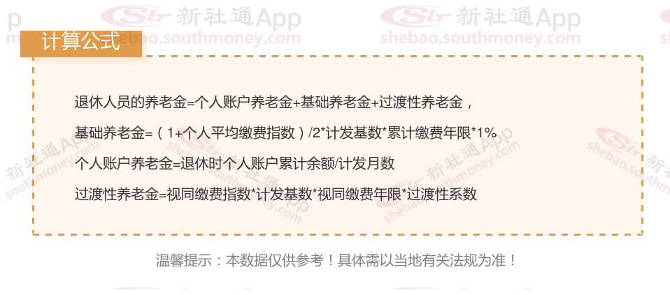 基本养老金=基础养老金+个人账户养老金+过渡性养老金=退休前一年全市职工月平均工资×20%(缴费年限不满15年的按15%)+个人账户本息和÷120+指数化月平均缴费工资×1997年底前缴费年限×1.4%。