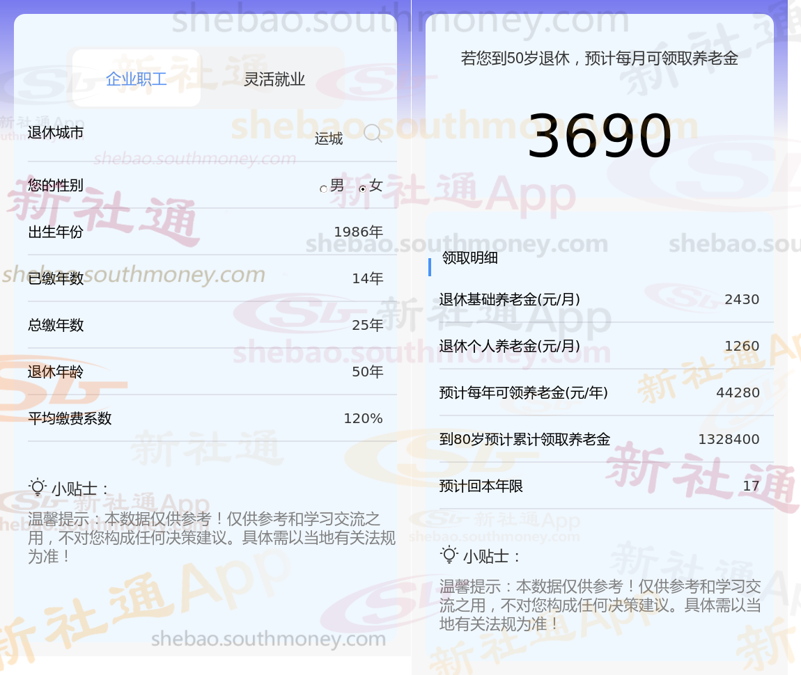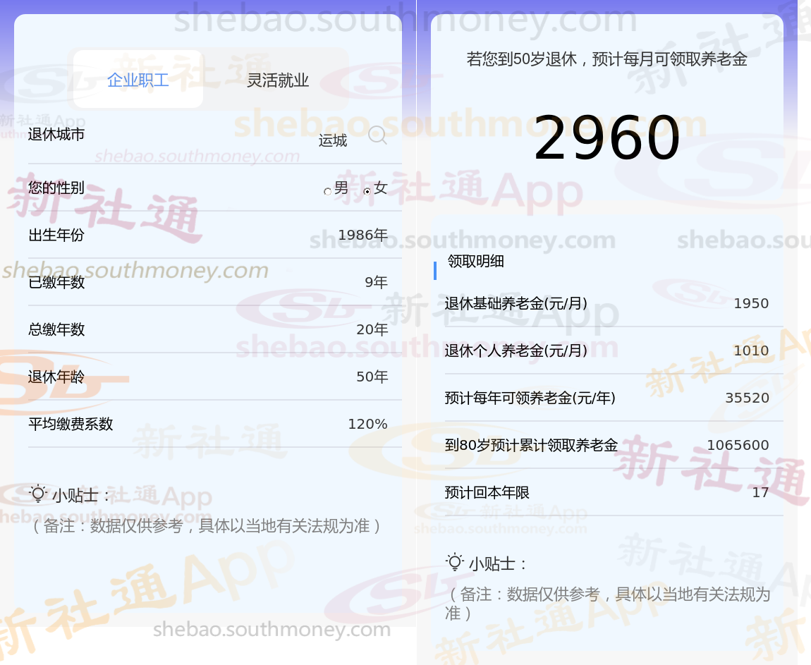 通过新社通APP-养老金计算所得:退休城市、出生年份、退休年龄、缴费系数都相同的情况下,社保缴费年限累计20年时,计算如下:
