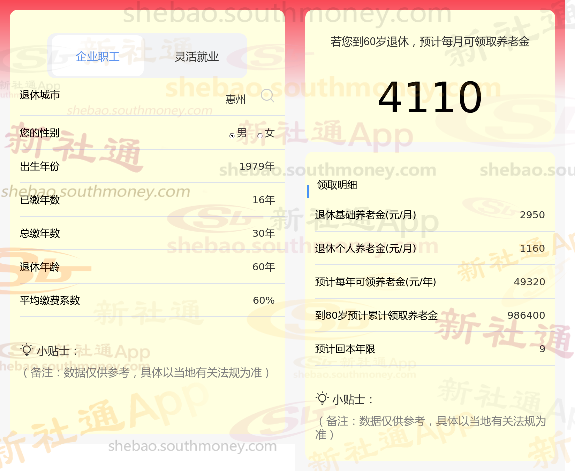 通过新社通APP-养老金计算所得:退休城市、出生年份、退休年龄、缴费系数都相同的情况下,社保缴费年限累计30年时,计算如下: