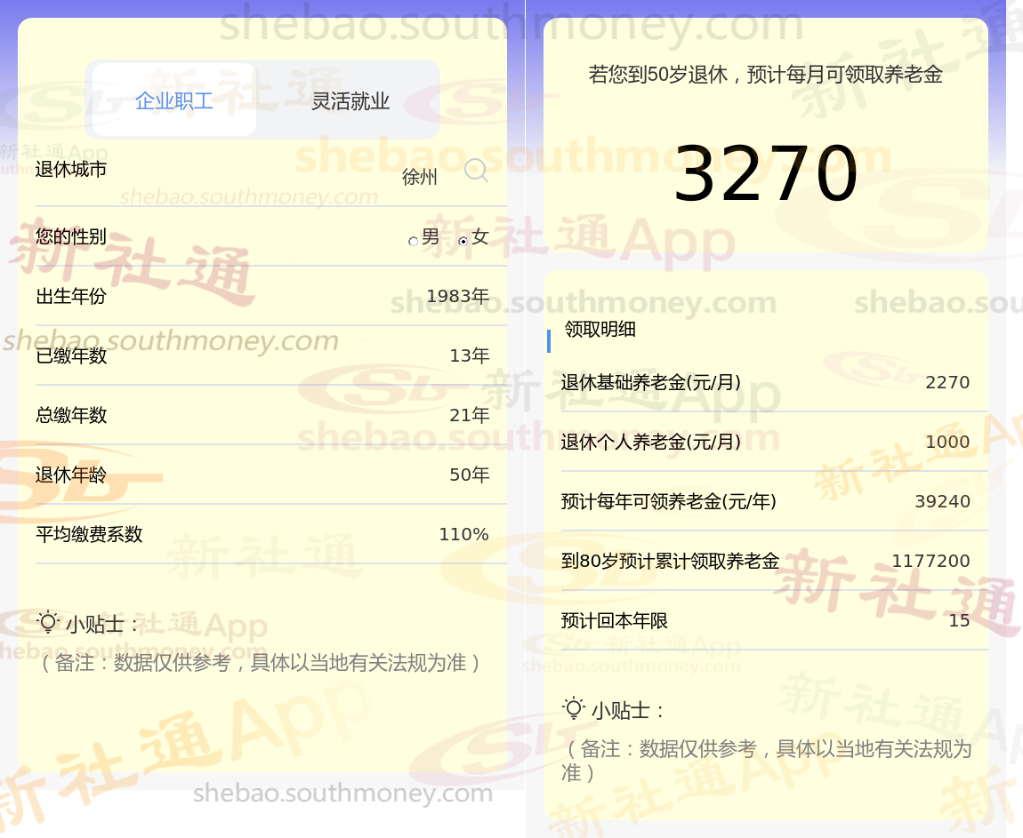 通过新社通APP-养老金计算所得:退休城市、出生年份、退休年龄、缴费系数都相同的情况下,社保缴费年限累计21年时,计算如下: