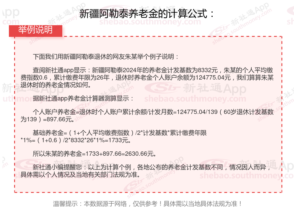 其中,计算公式不相同,我们用在新疆阿勒泰退休网友举个例子说明一下,新疆阿勒泰2024年的计发基数则为8332元,个人平均缴费指数0.6,该网友累计缴费年限为15年(含视同缴费年限6年),退休时账户余额为71985.6元,视同缴费指数为0.6,新疆阿勒泰的过渡性指数为1.30%,我们算算这位网友退休时的养老金情况如何。