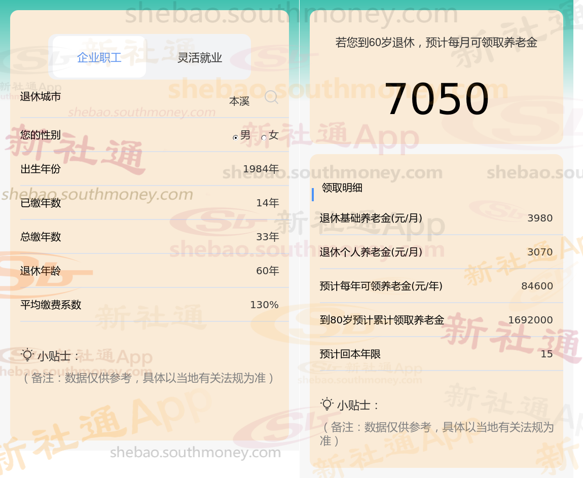 通过新社通APP-养老金计算所得:退休城市、出生年份、退休年龄、缴费系数都相同的情况下,社保缴费年限累计33年时,计算如下: