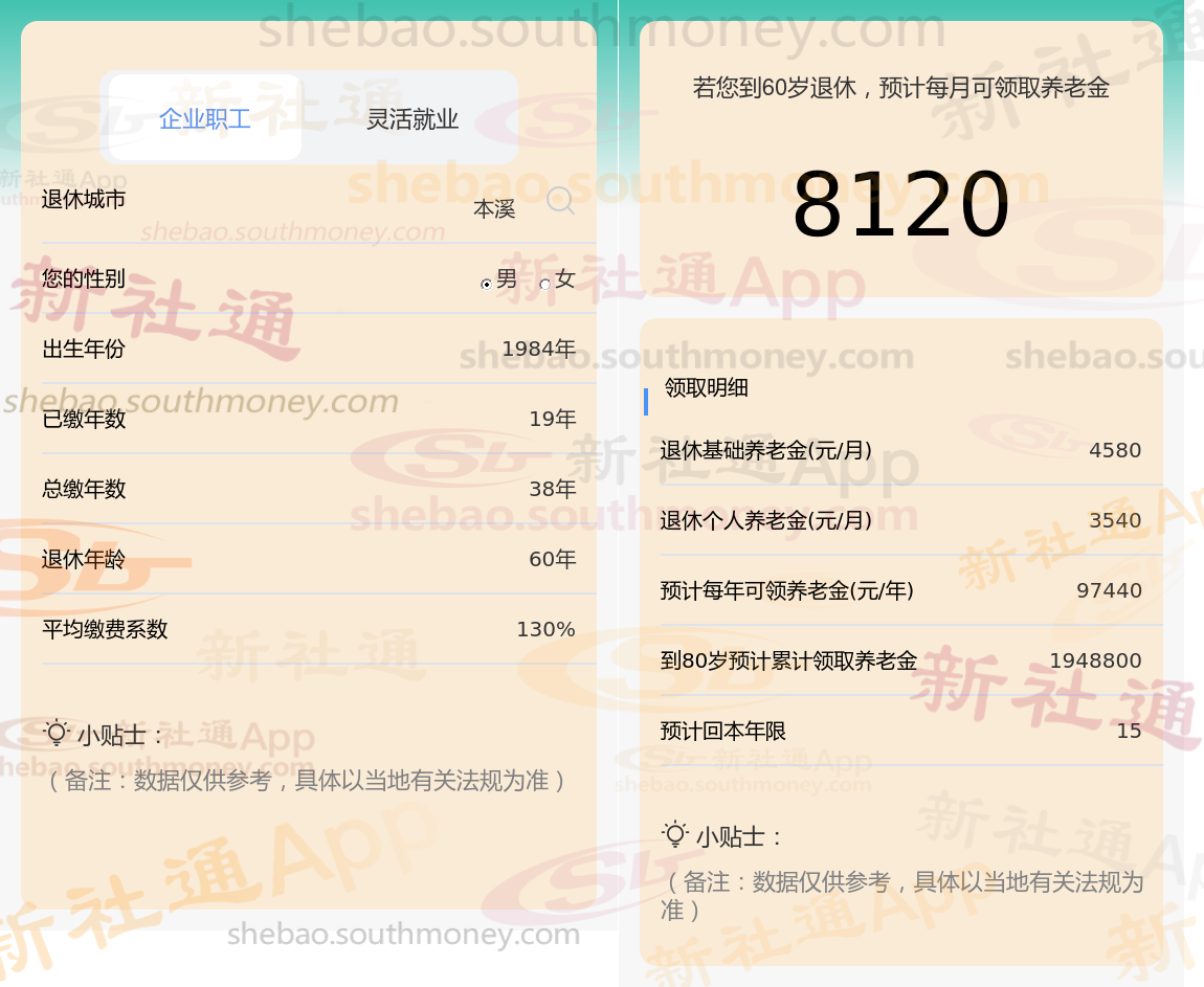 通过新社通APP-养老金计算所得:退休城市、出生年份、退休年龄、缴费系数都相同的情况下,社保缴费年限累计38年时,计算如下: