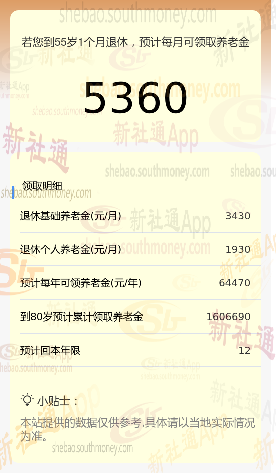 基础养老金估算:在综合考量各项因素后,基础养老金的测算金额为3430元。