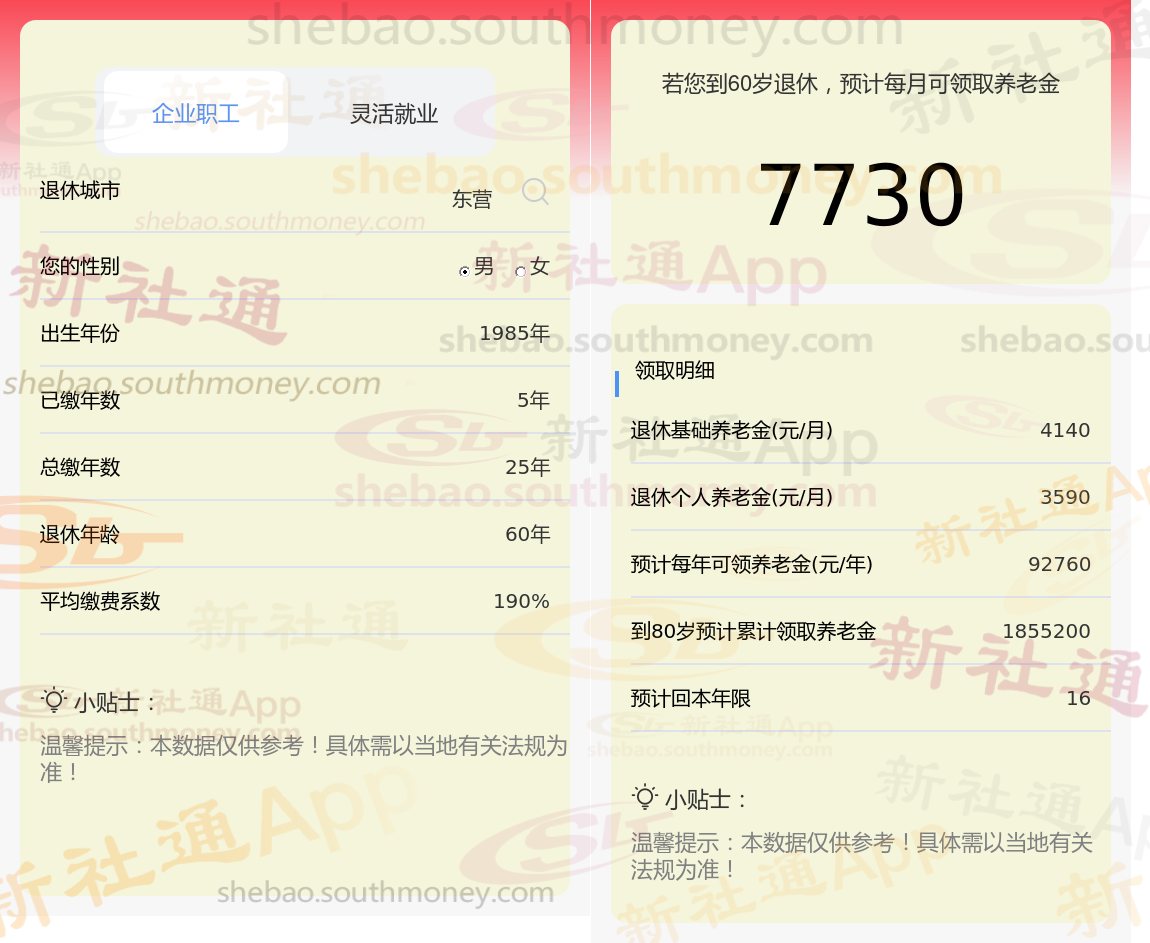 通过新社通APP-养老金计算所得:退休城市、出生年份、退休年龄、缴费系数都相同的情况下,社保缴费年限累计25年时,计算如下: