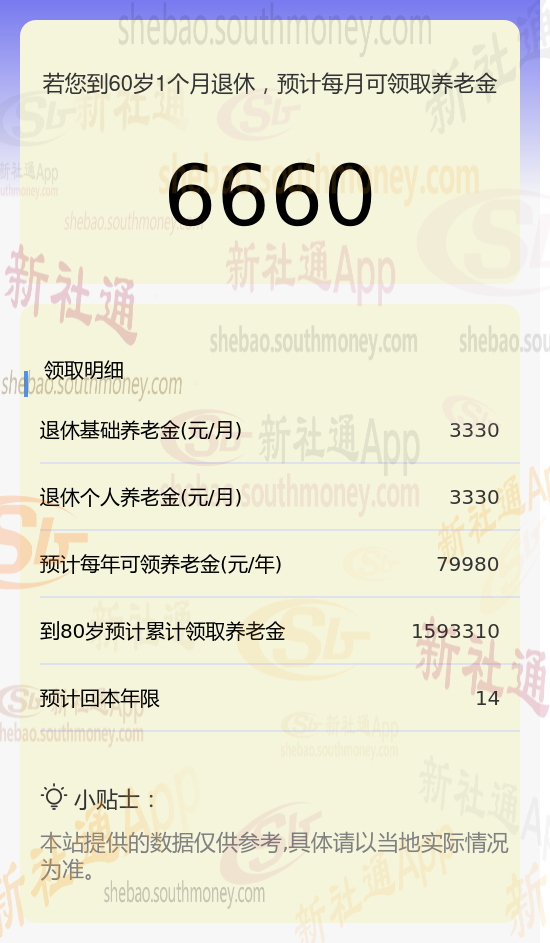 现在,我们来计算一下每月可领取的养老金总额。只需将基础养老金的3330元与个人养老金的3330元相加,得到的总数就是每月可以领取的养老金,大约是6660元。这个数字象征着您退休后每月可以期待的一笔稳定收入。
