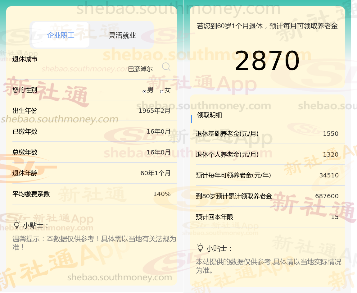 退休城市:巴彦淖尔,性别:男,出生年份:1965,总缴年数16年,缴费档次:140%,新社通app养老金计算器所得: