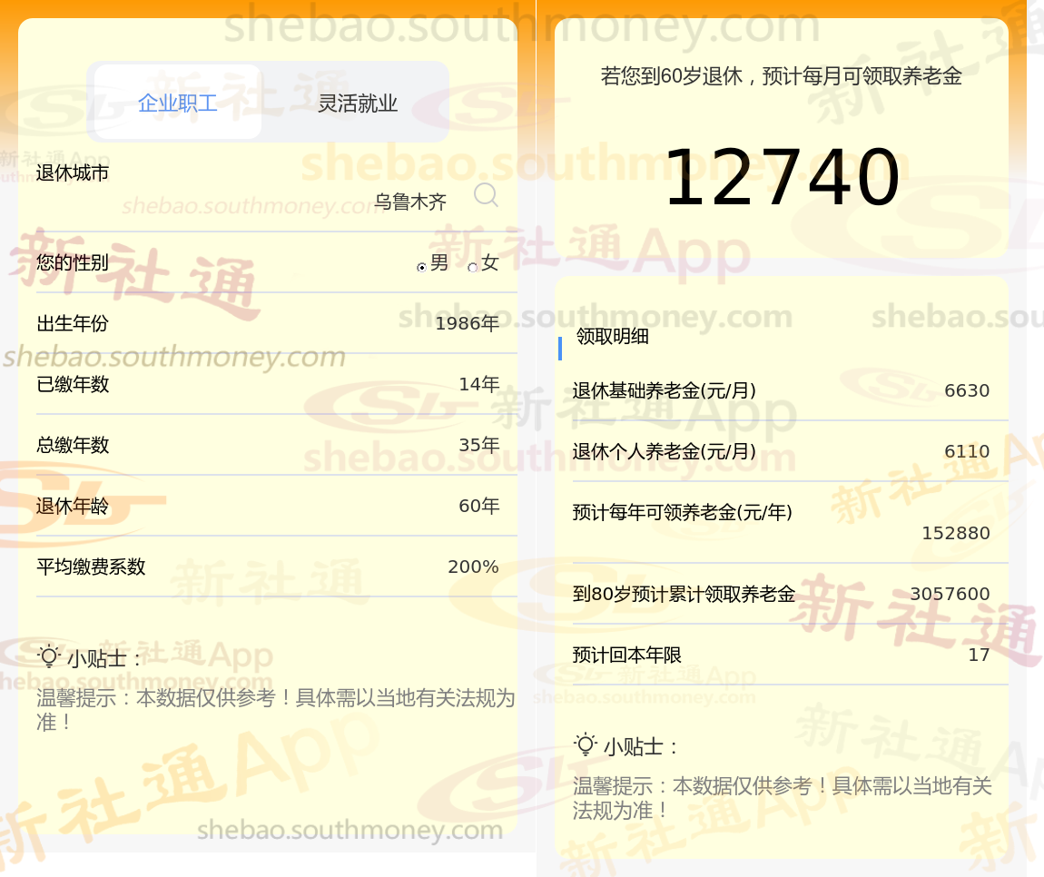通过新社通APP-养老金计算所得:退休城市、出生年份、退休年龄、缴费系数都相同的情况下,社保缴费年限累计35年时,计算如下: