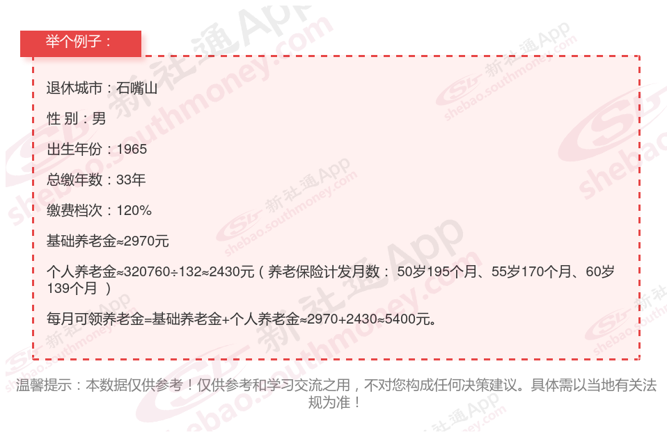 同事林某退休城市在石嘴山,性别:男,出生年份:1965,总缴年数33年,缴费档次:120%,新社通app养老金计算器所得: