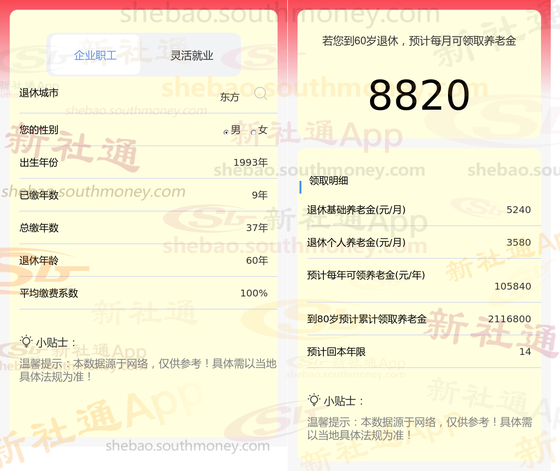 通过新社通APP-养老金计算所得:退休城市、出生年份、退休年龄、缴费系数都相同的情况下,社保缴费年限累计37年时,计算如下: