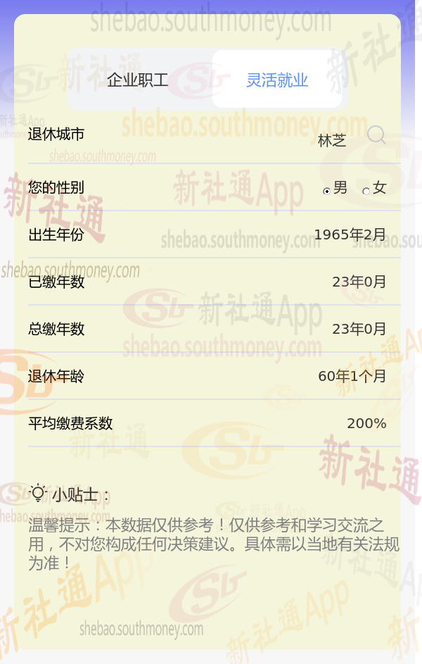 朱某一位1965年出生的男性,目前定居在风景秀丽的林芝并享受着退休生活。他的社会保险缴纳年限是23年,且一直以较高的200%档次进行缴费,展现了他对未来生活的充分规划与准备。