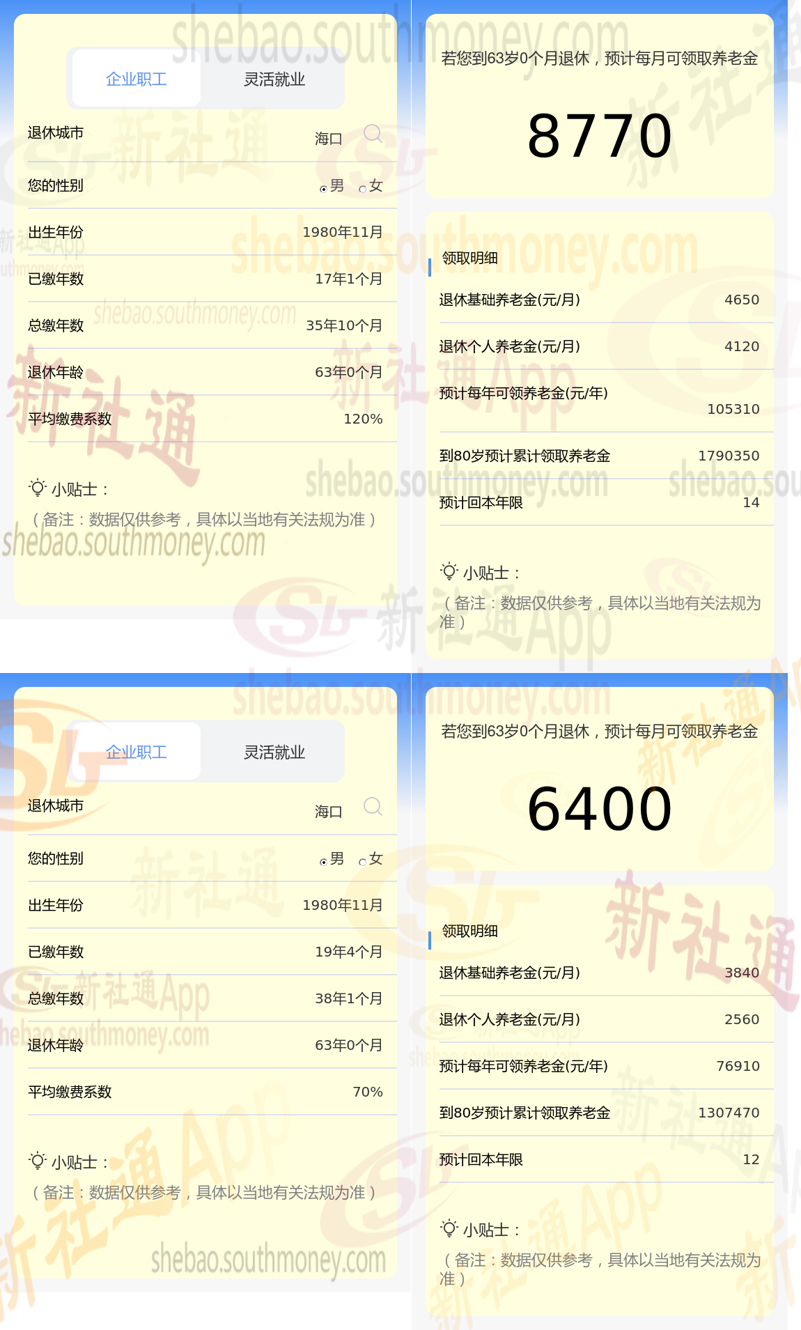 谢某:退休城市海口,社保缴费年限35年,63周岁退休,按120%缴费档位。