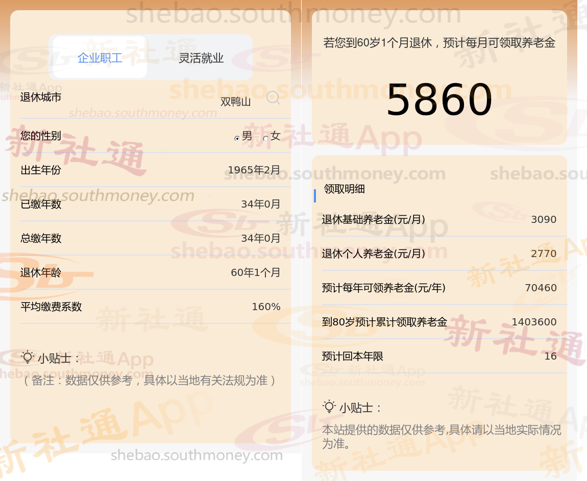 退休城市:双鸭山,性别:男,出生年份:1965,总缴年数34年,缴费档次:160%,新社通app养老金计算器所得: