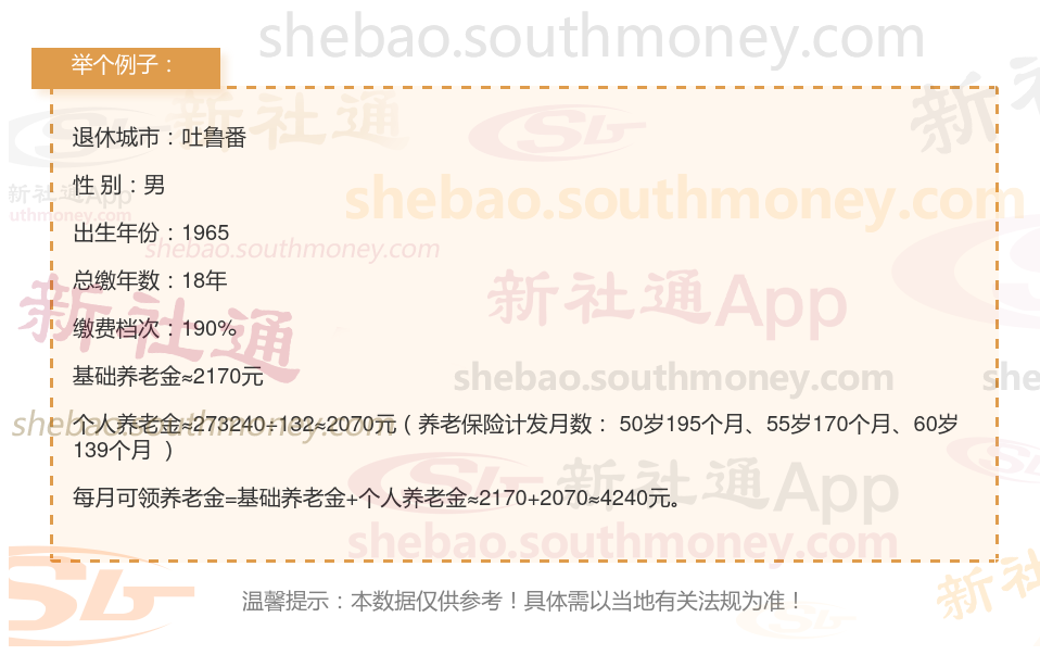 网友希某退休城市在吐鲁番,性别:男,出生年份:1965,总缴年数18年,缴费档次:190%