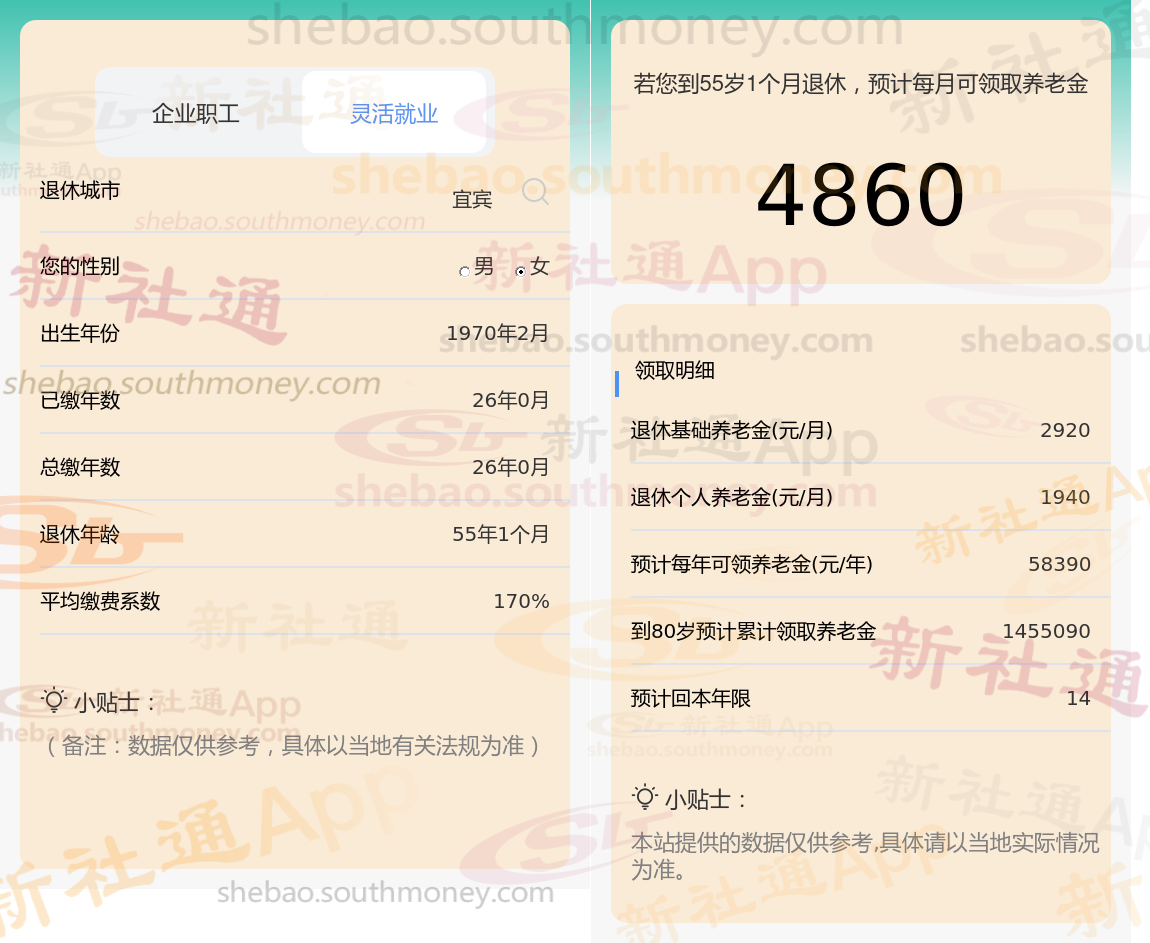 退休城市:宜宾,性别:女,出生年份:1970,总缴年数26年,缴费档次:170%,新社通app养老金计算器所得:
