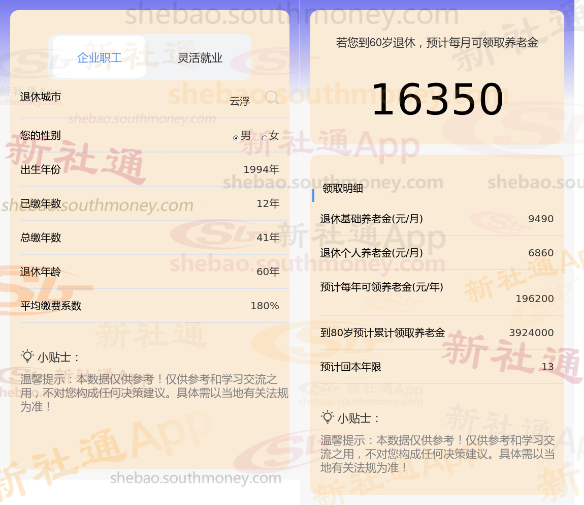 通过新社通APP-养老金计算所得:退休城市、出生年份、退休年龄、缴费系数都相同的情况下,社保缴费年限累计41年时,计算如下:
