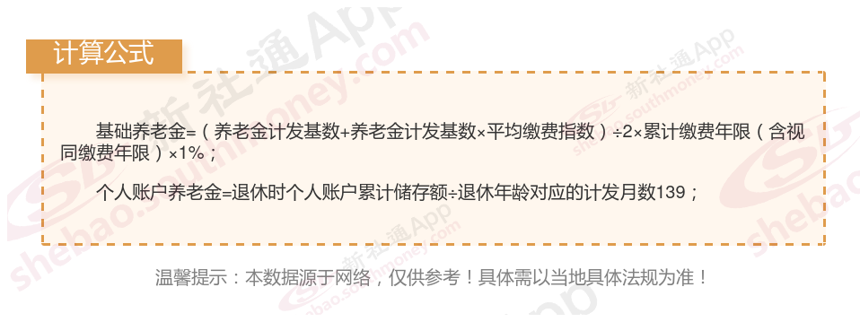 个人养老金=养老保险个人账户累计储存额÷退休年龄确定的计发月数(养老保险计发月数:50岁195个月、55岁170个月、60岁139个月)2950元