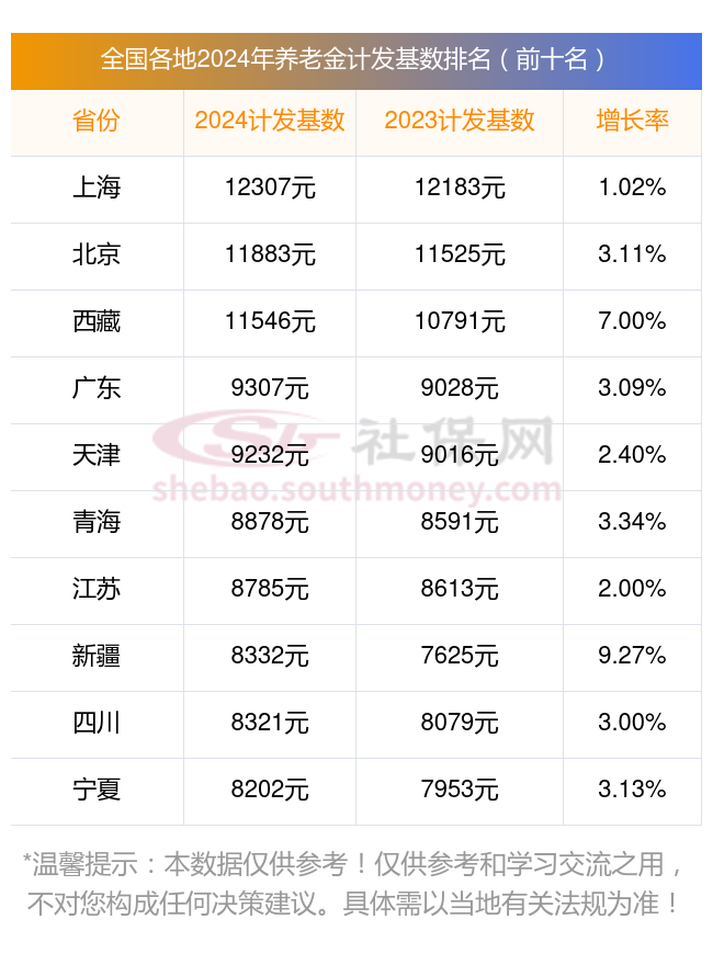 截至目前,2023年全国养老金计发基数排名前十名情况如下