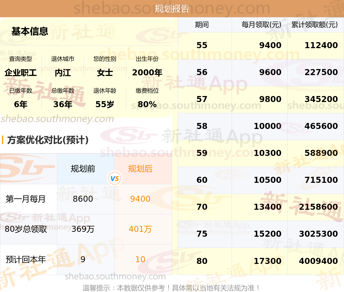 规划前:参保城市:内江,性别:女士,出生年月:2000,已缴年限:6年,总缴年数:36年,退休年龄:55岁,缴费档位:80%。
