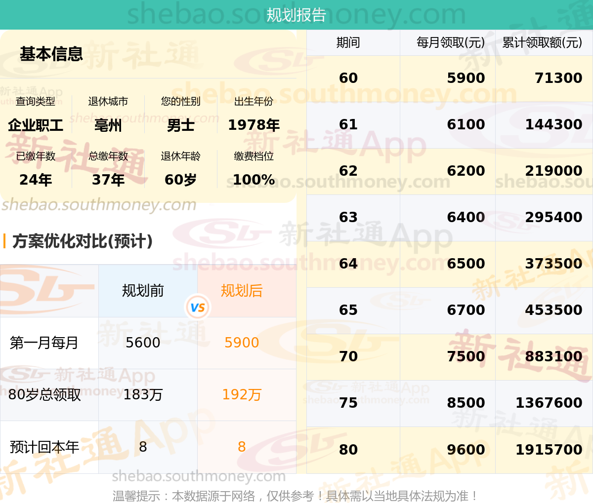 规划后每月可多领养老金:5900-5600=300元