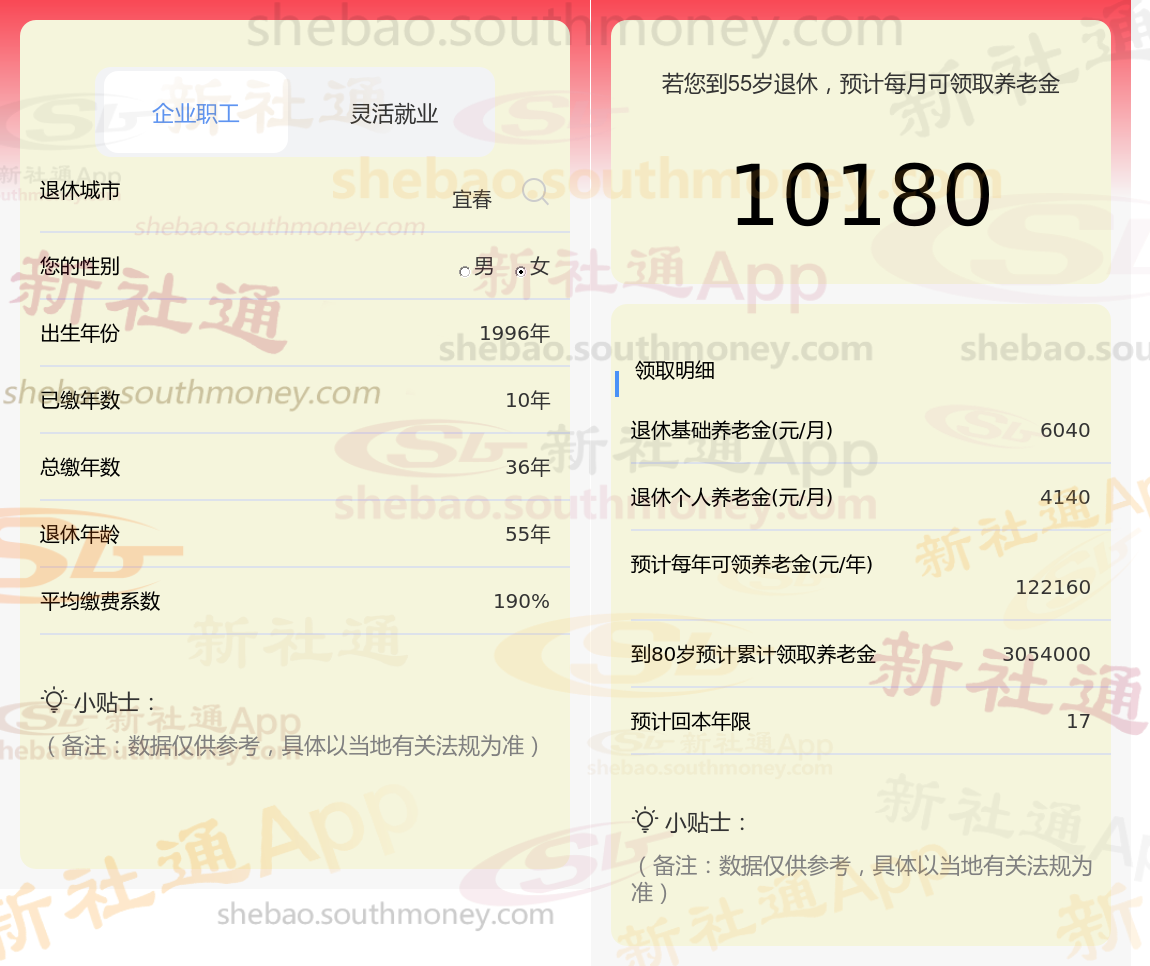 通过新社通APP-养老金计算所得:退休城市、出生年份、退休年龄、缴费系数都相同的情况下,社保缴费年限累计36年时,计算如下: