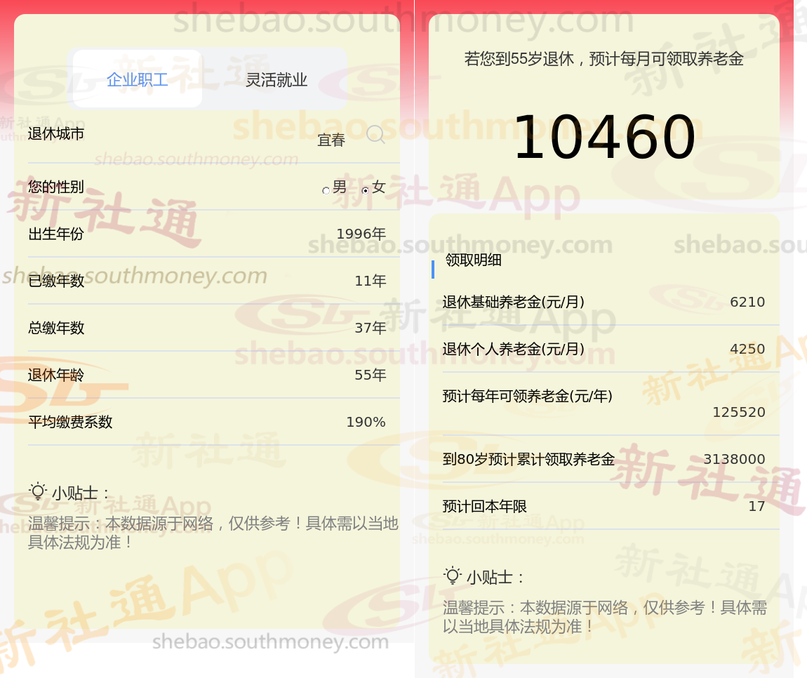通过新社通APP-养老金计算所得:退休城市、出生年份、退休年龄、缴费系数都相同的情况下,社保缴费年限累计37年时,计算如下: