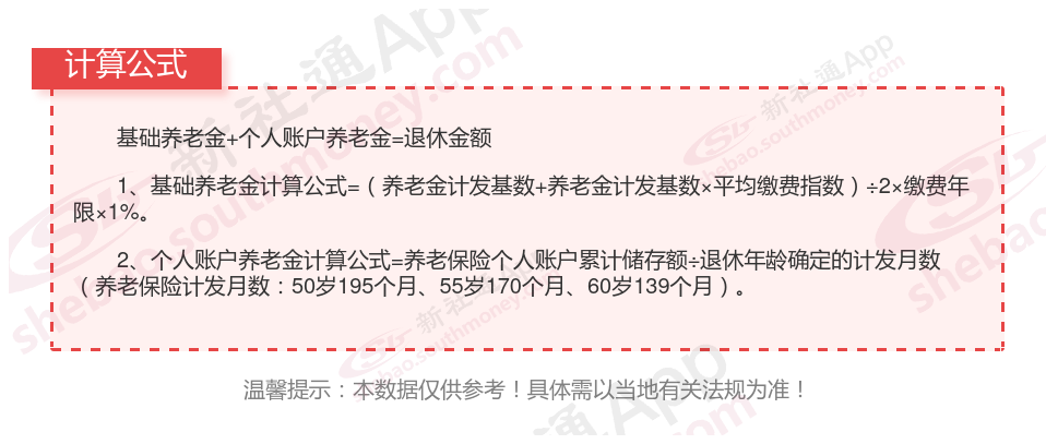 基本养老金=当地上年度在岗职工月平均工资×20/100实际缴费工资累计额的11%/10年×12月(/代替除号)。每月大约5390元。