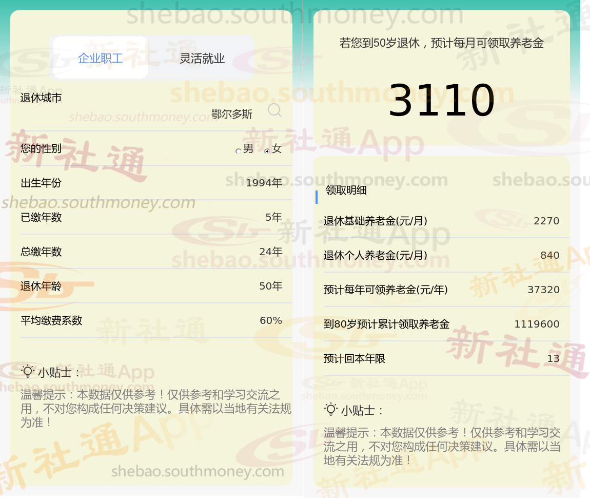 通过新社通APP-养老金计算所得:退休城市、出生年份、退休年龄、缴费系数都相同的情况下,社保缴费年限累计24年时,计算如下: