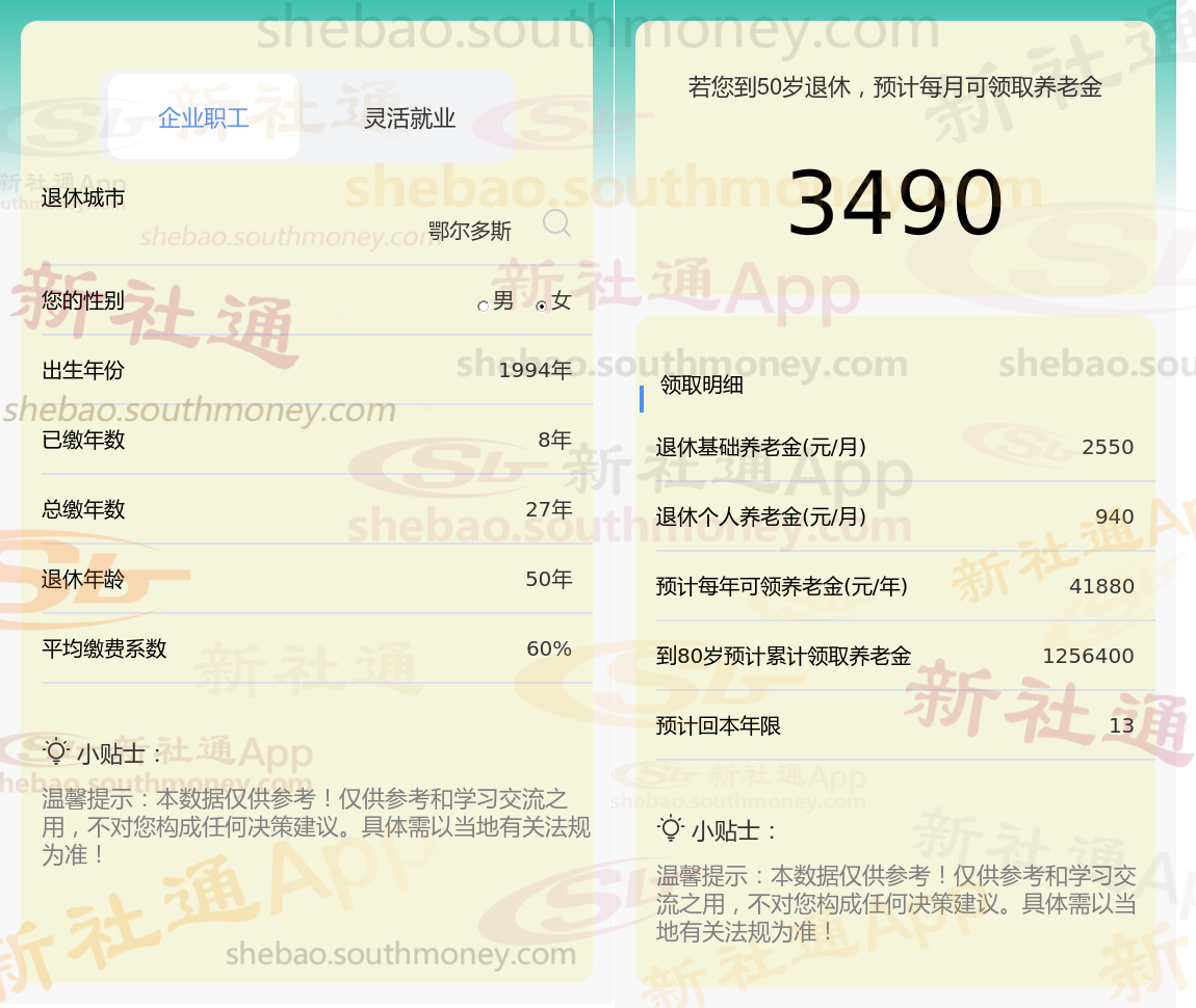 通过新社通APP-养老金计算所得:退休城市、出生年份、退休年龄、缴费系数都相同的情况下,社保缴费年限累计27年时,计算如下: