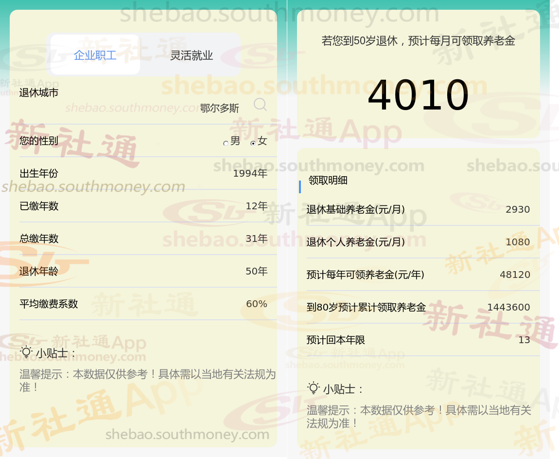 通过新社通APP-养老金计算所得:退休城市、出生年份、退休年龄、缴费系数都相同的情况下,社保缴费年限累计31年时,计算如下: