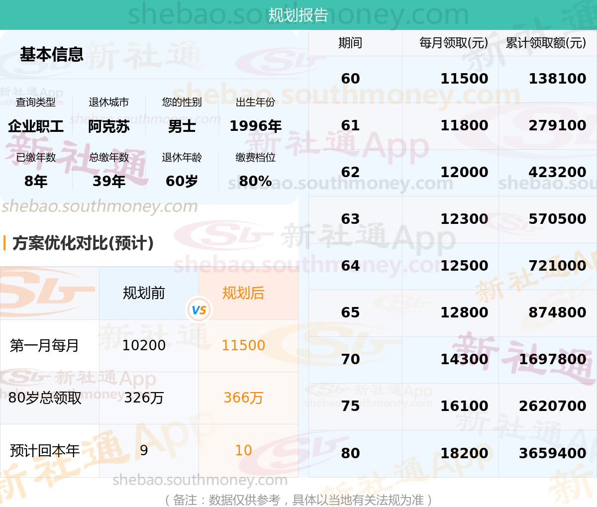规划前:参保城市:阿克苏,性别:男士,出生年月:1996,已缴年限:8年,总缴年数:39年,退休年龄:60岁,缴费档位:80%。