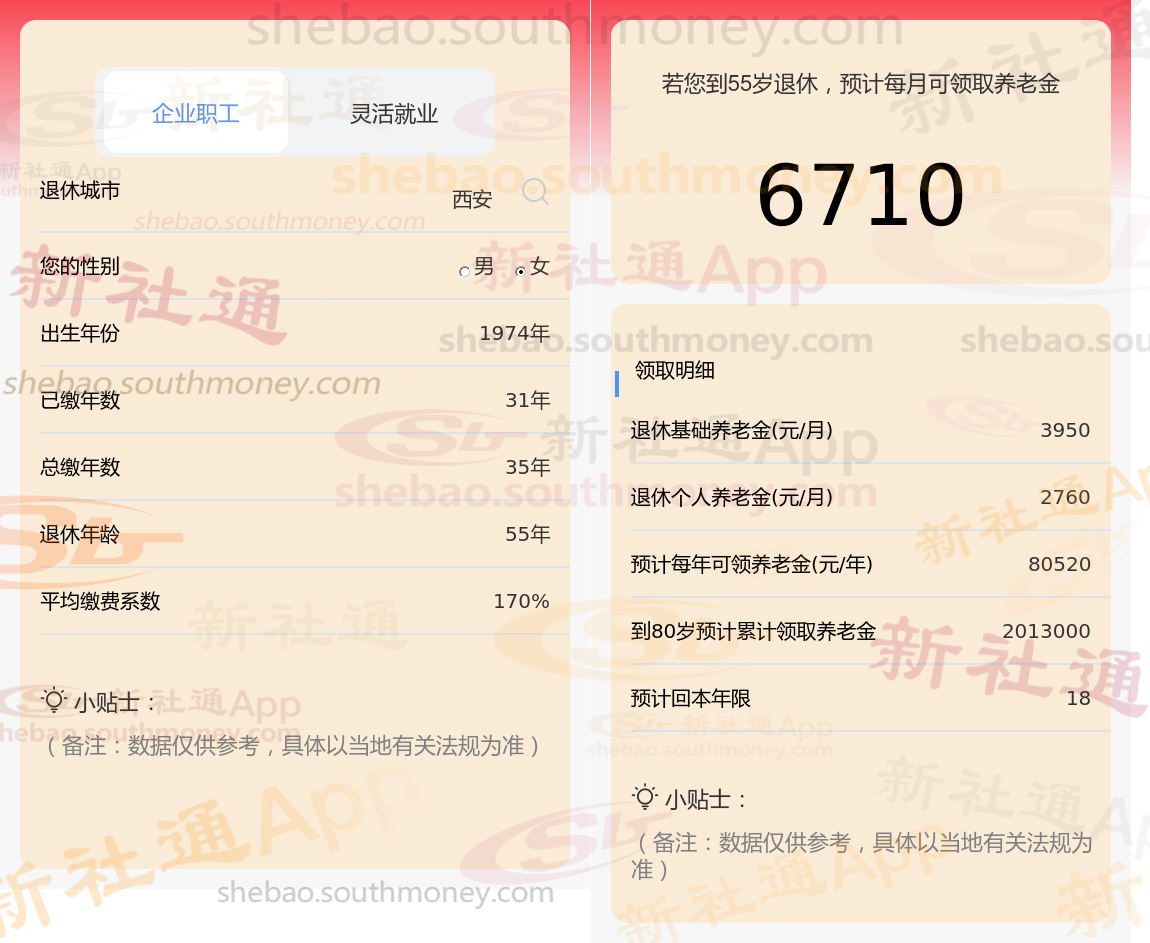 通过新社通APP-养老金计算所得:退休城市、出生年份、退休年龄、缴费系数都相同的情况下,社保缴费年限累计35年时,计算如下: