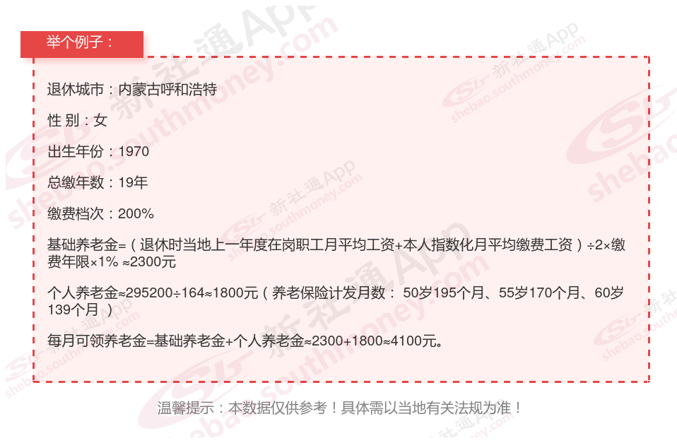 网友康某退休城市在内蒙古呼和浩特,性别:女,出生年份:1970,总缴年数19年,缴费档次:200%