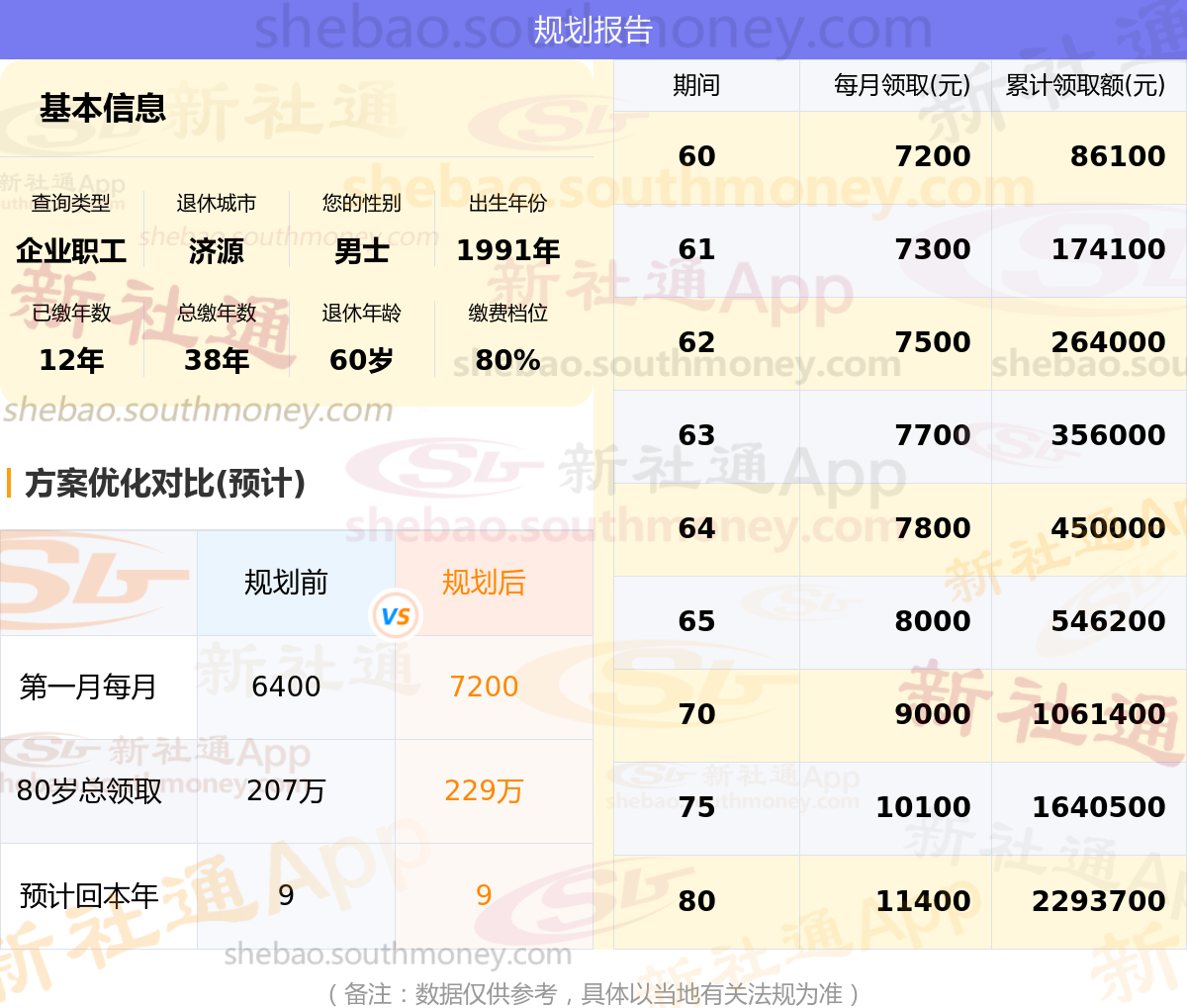 规划前:60岁第一个月约领6400元,新社通APP-养老金规划后:60岁第一个月约领7200元