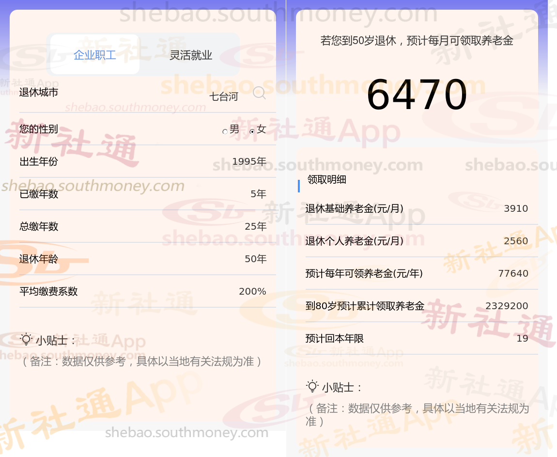 通过新社通APP-养老金计算所得:退休城市、出生年份、退休年龄、缴费系数都相同的情况下,社保缴费年限累计25年时,计算如下: