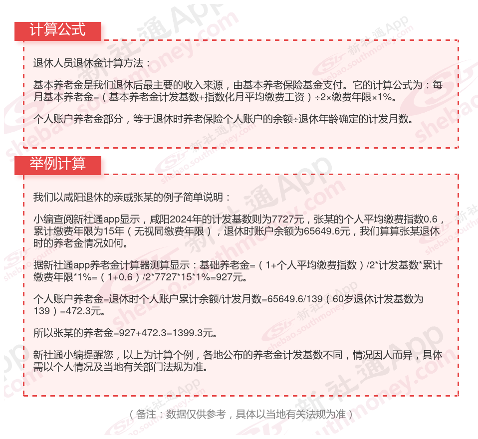 基本养老金=(退休时上年度全市城镇单位就业人员月平均工资+本人指数化月平均缴费工资)÷2×缴费年限×1%。