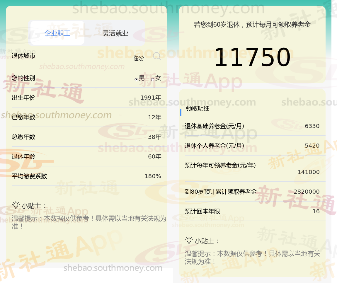 通过新社通APP-养老金计算所得:退休城市、出生年份、退休年龄、缴费系数都相同的情况下,社保缴费年限累计38年时,计算如下: