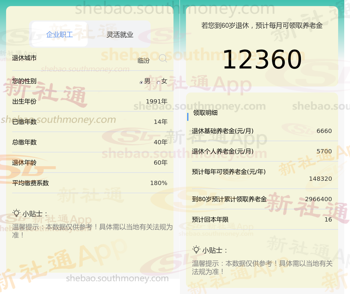 通过新社通APP-养老金计算所得:退休城市、出生年份、退休年龄、缴费系数都相同的情况下,社保缴费年限累计40年时,计算如下: