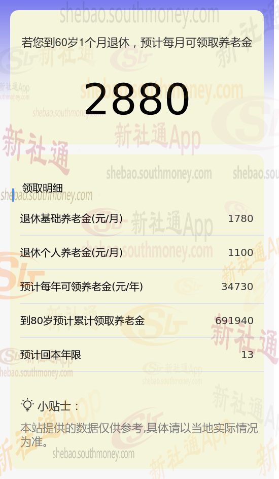 新社通app养老金计算器计算所得: