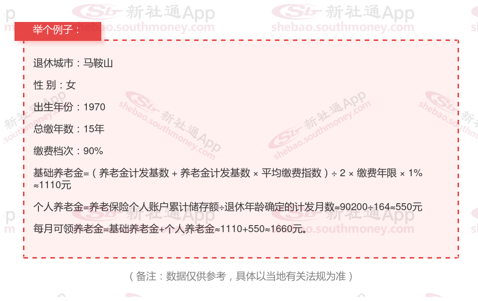 退休城市:马鞍山,性别:女,出生年份:1970,总缴年数15年,缴费档次:90%,新社通app养老金计算器所得: