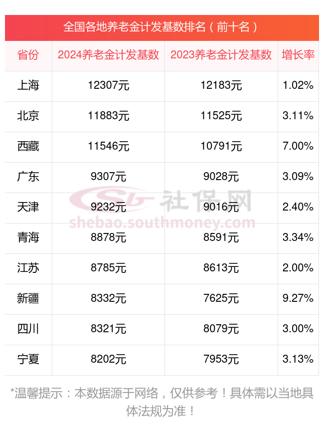 据新社通app显示,2024年上海位列第一位,养老金计发基数达到12307.00元;北京排名第二,养老金计发基数为11883.00元;西藏排名第三,养老金计发基数11546.00元。排名前10的还有:广东、天津、青海、江苏、湖北、新疆、四川。